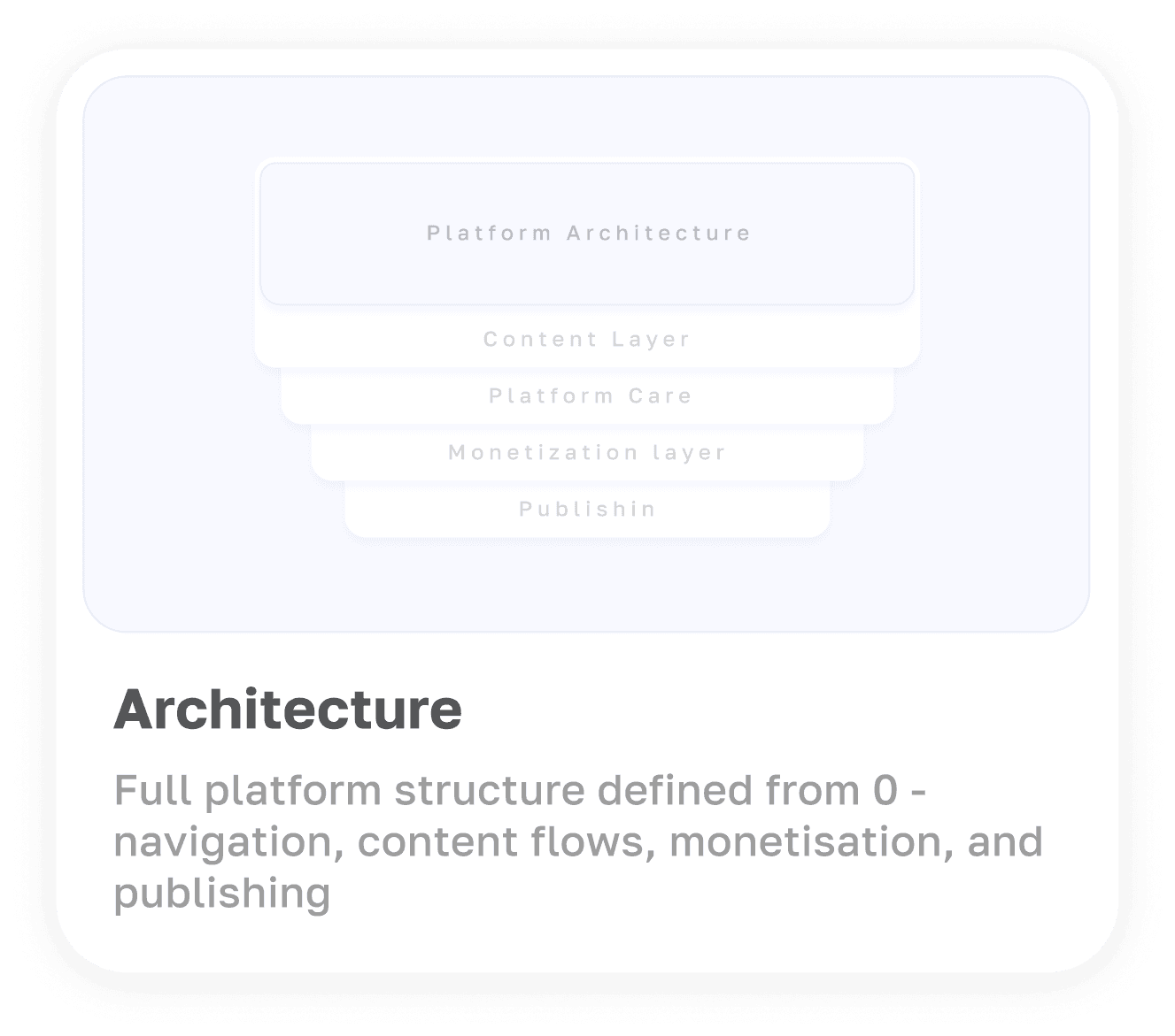 The work established the structural foundation for the platform and enabled the development team to move forward with a clear product direction. Key outcomes included: • defining the product architecture of the platform • establishing content publishing and discovery flows • integrating monetization into the core product experience • building a scalable design system for future development