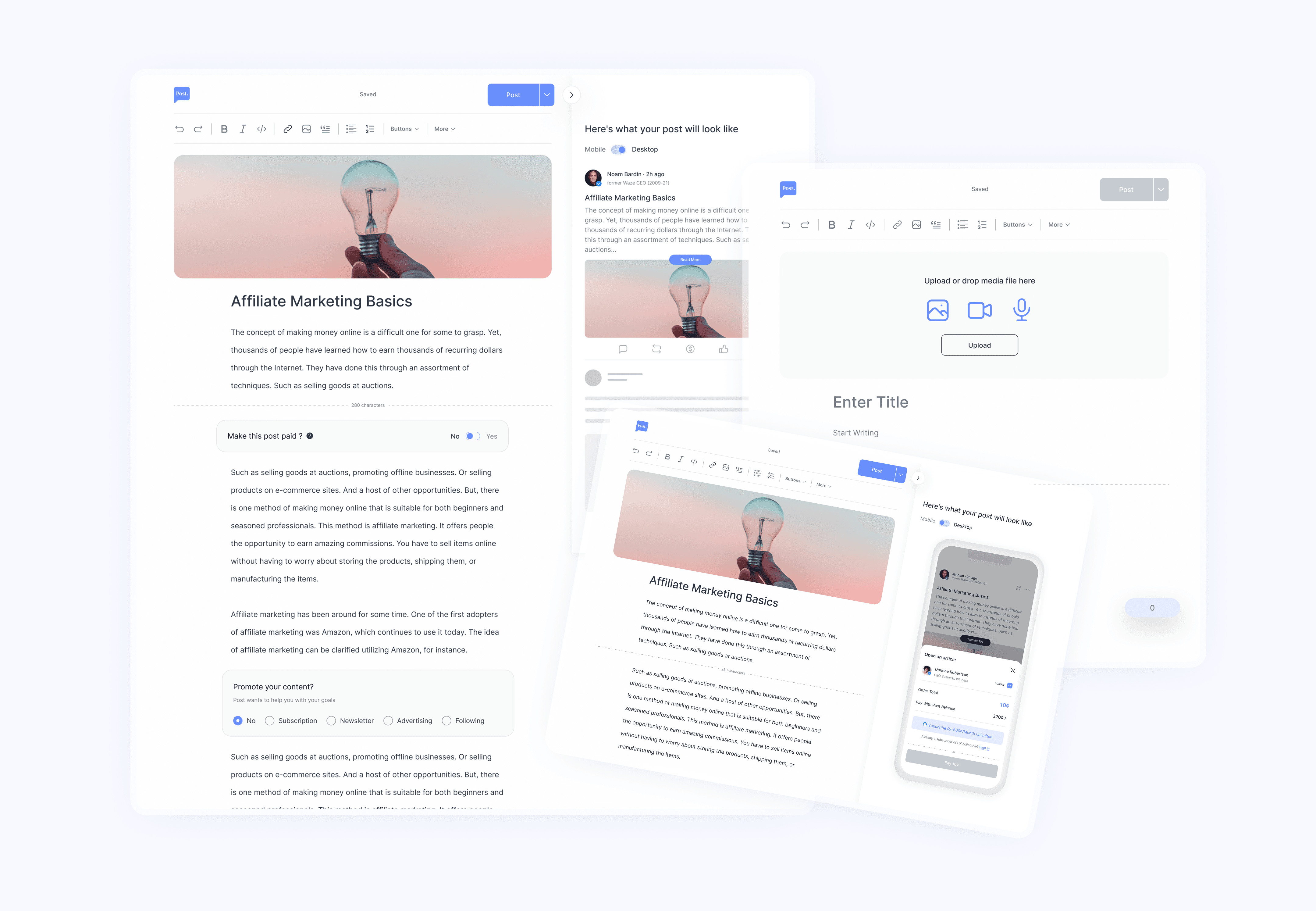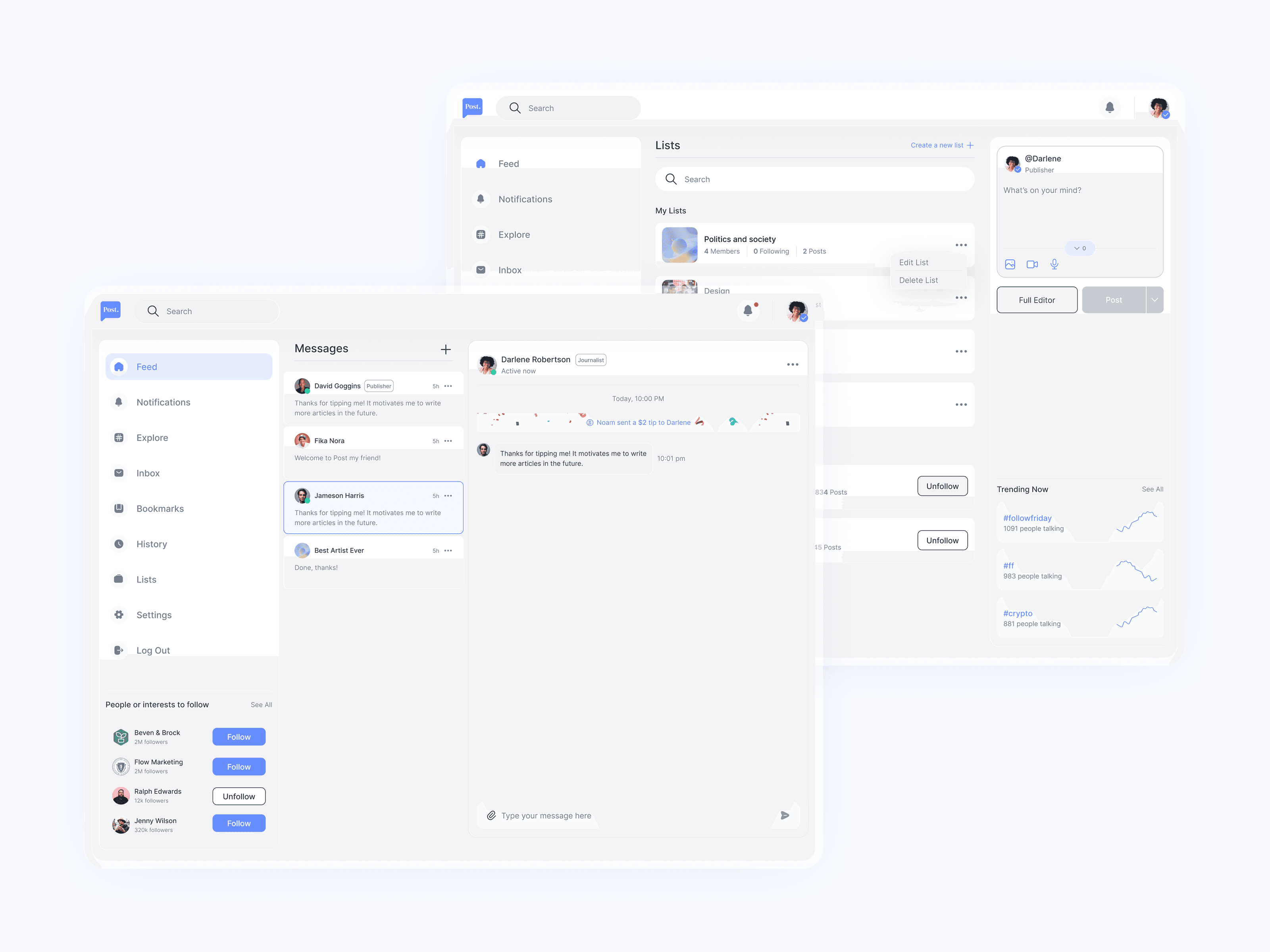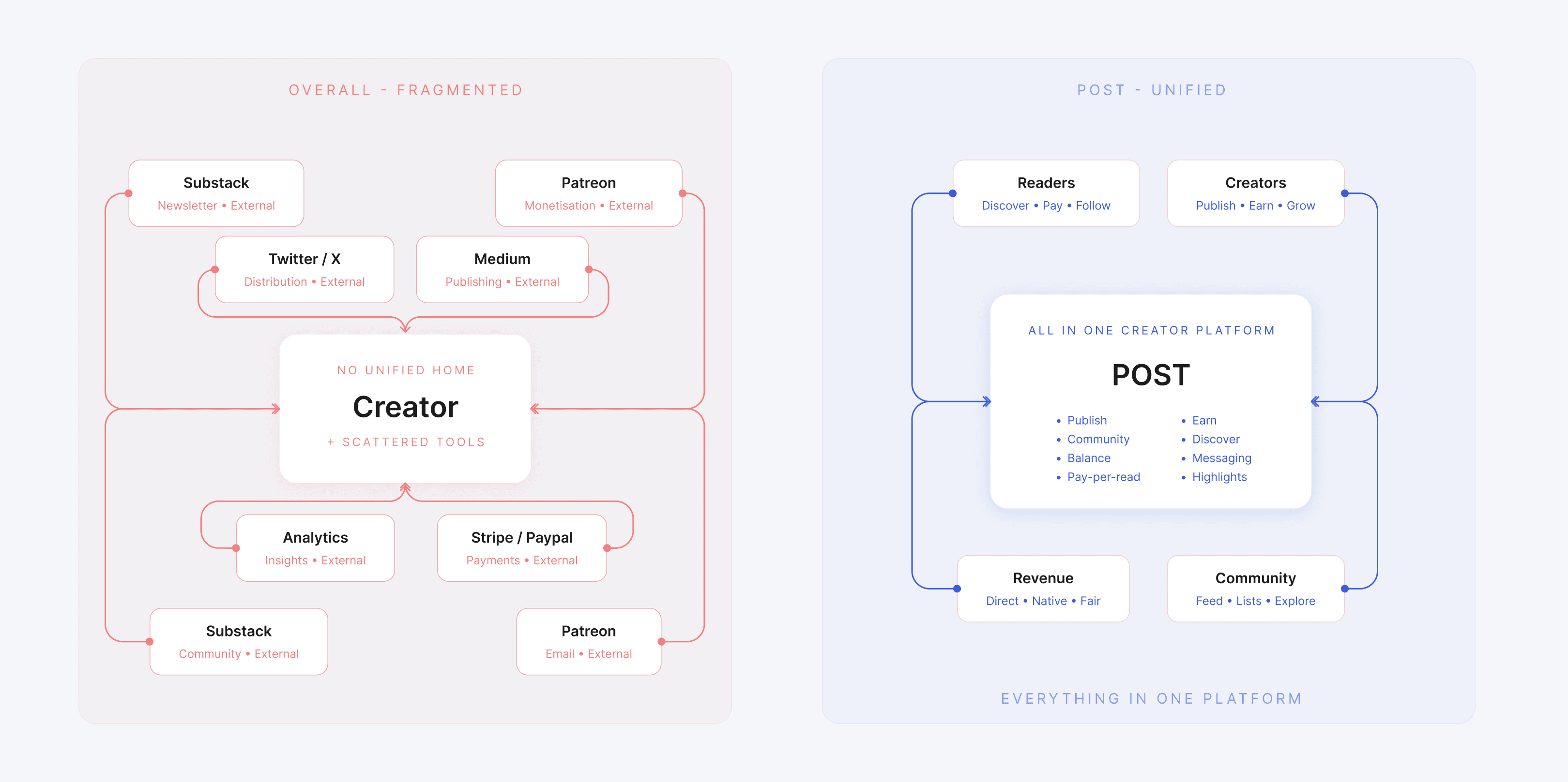 Most social platforms prioritize engagement and advertising revenue, leaving creators dependent on external monetization channels. The challenge for Post was to design a product ecosystem where: • creators could publish and grow audiences • users could discover and interact with valuable content • monetization mechanisms were integrated directly into the platform The system needed to support a healthy balance between content discovery, community interaction, and creator sustainability.